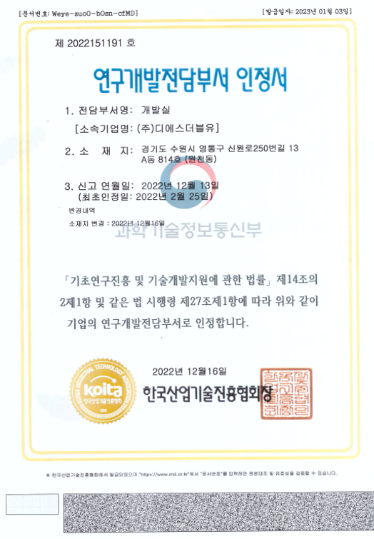 보유인증서 연구개발전담부서 인정서 페이지 정보 작성자 DSW 댓글 0건 조회 60회 작성일 24-07-15 16:16 목록 본문 연구개발전담부서 인정서 이전글벤처기업 확인서 24.07.15 다음글특허증 (제 10-2454997호) 24.07.15 댓글 0 댓글목록 등록된 댓글이 없습니다.